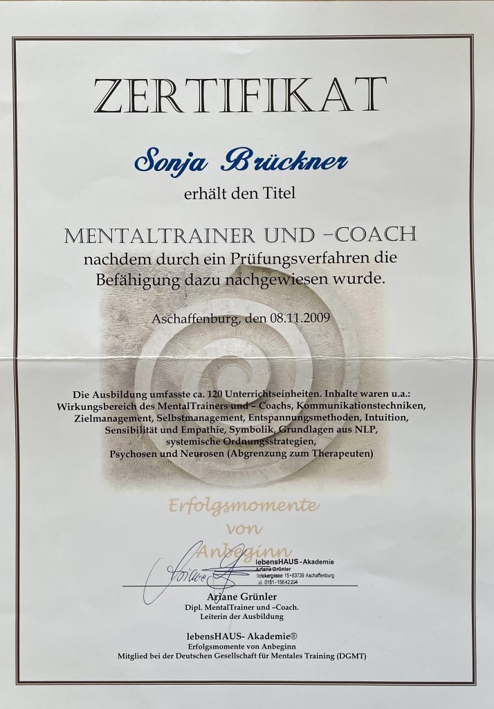 Seit 2009  Mentaltrainerin / Coach, Klangpraktikerin, Maditationstrainerin und Entspannungscoach